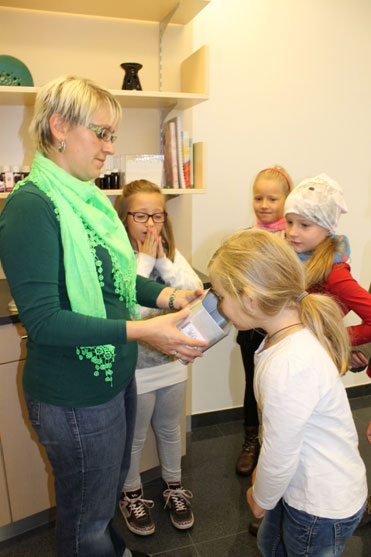 An einer weiteren Station durften die Kinder in die Welt der Aromen und Düfte eintauchen. Unsere Aromaexpertin Andrea Deinhofer erklärte anschaulich die Wirkung und Verwendung der verschiedenen ätherischen Öle und führte die Kinder auch in die Welt der Arzneitees – natürlich mit Teeverkostung.
